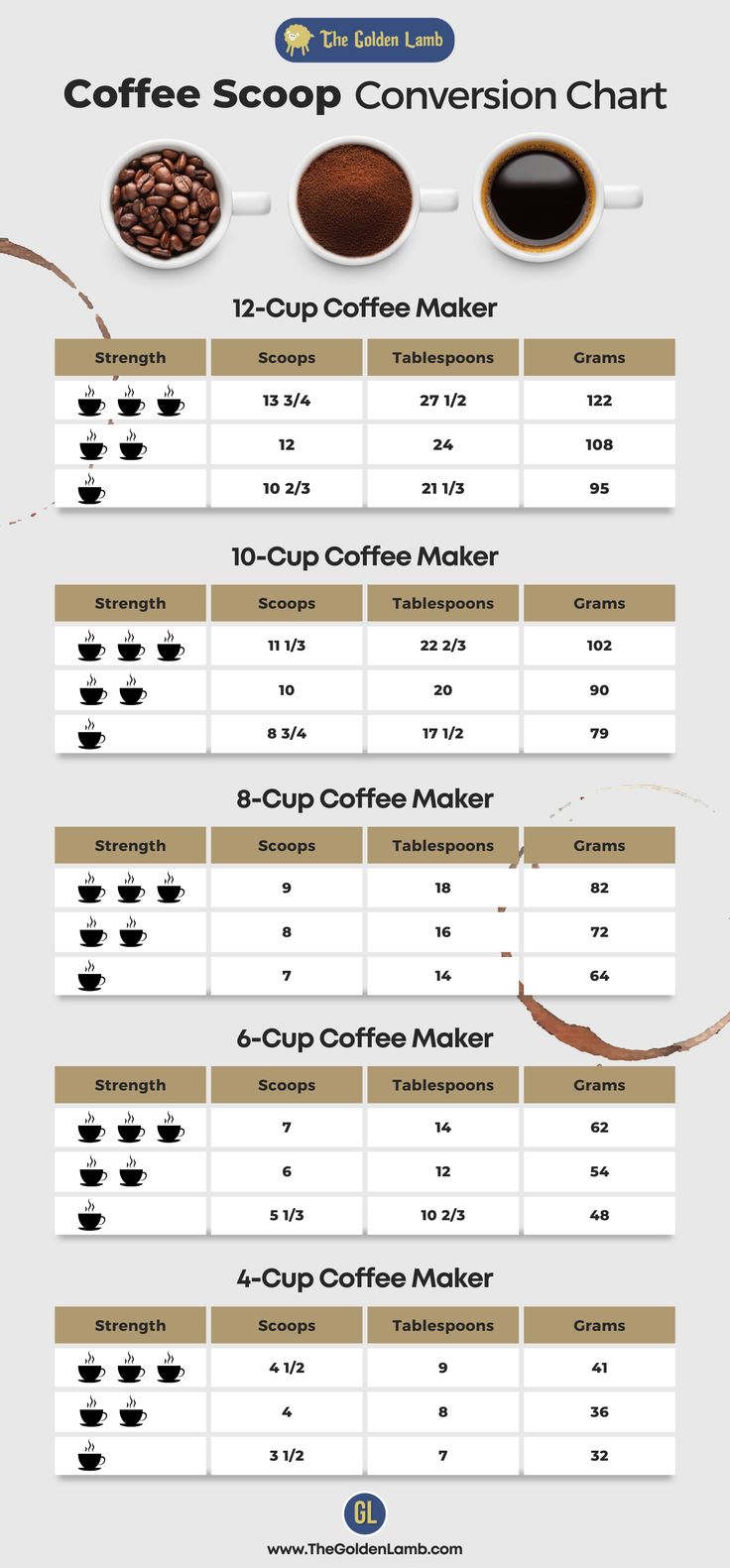 - If a scale is not available, 4 tablespoons of coffee beans can be used, with 2 tablespoons of ground coffee for each cup.
